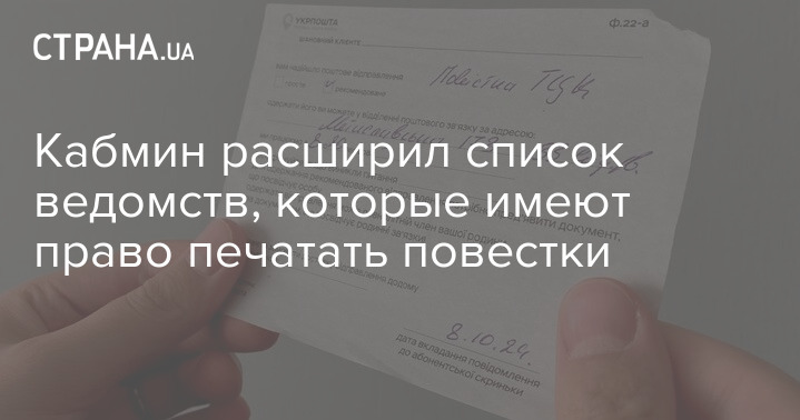 В Україні прискорять друк повісток, а відтак і їхнє розсилання військовозобов'язаним. Кабінет міністрів прийняв постанову №1062, якою дозволив друкувати повістки обласним та Київському міському ТЦК та СП. До цього їх могли випускати лише Міністерство оборони та державні поліграфічні підприємства.