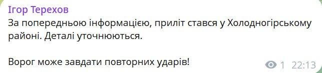 22.15 У Харкові приліт у Холодногірському районі, повідомив мер Терехов.