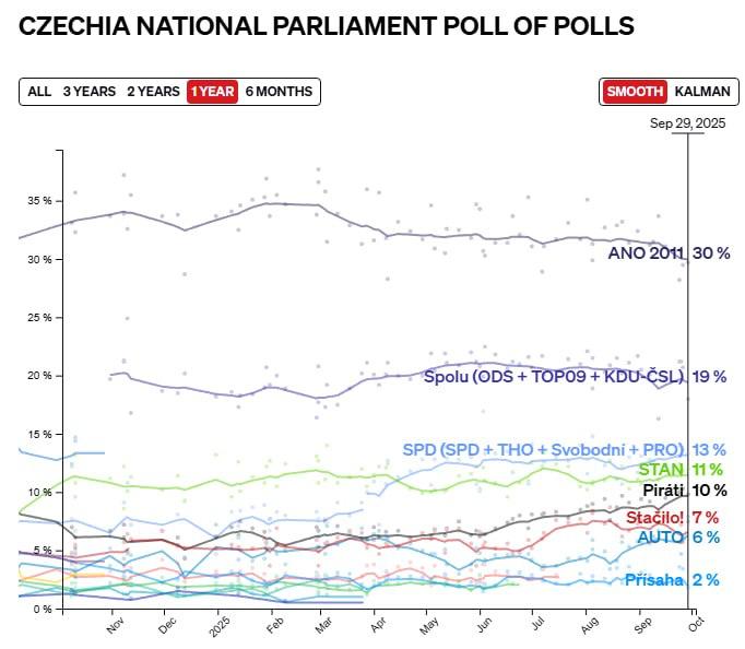 За опитуваннями Politico, партія Бабіша ANO має 30% підтримки, блок прем'єра Петра Фіали 19%, а націоналісти з партії "Свобода та пряма демократія" (SPD) - 13%.