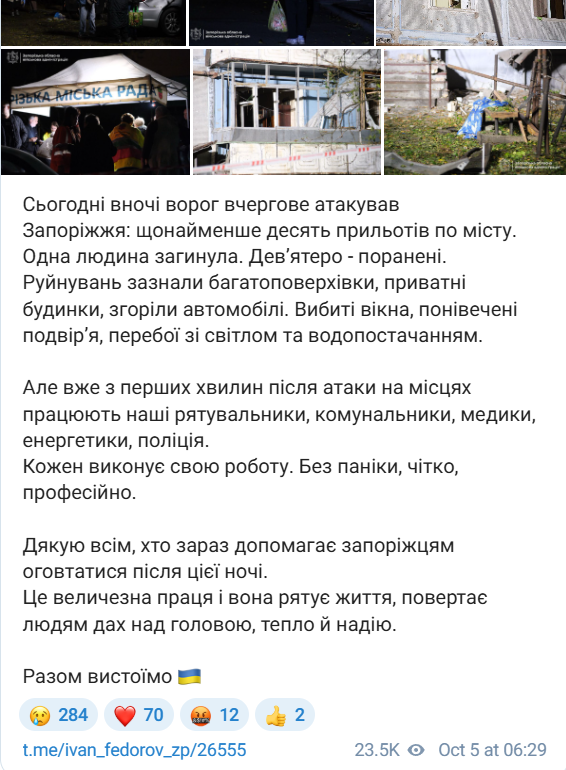 У ніч на 5 жовтня Росія завдала масованого комбінованого удару по Запоріжжю. Зафіксовано щонайменше десять попадань.