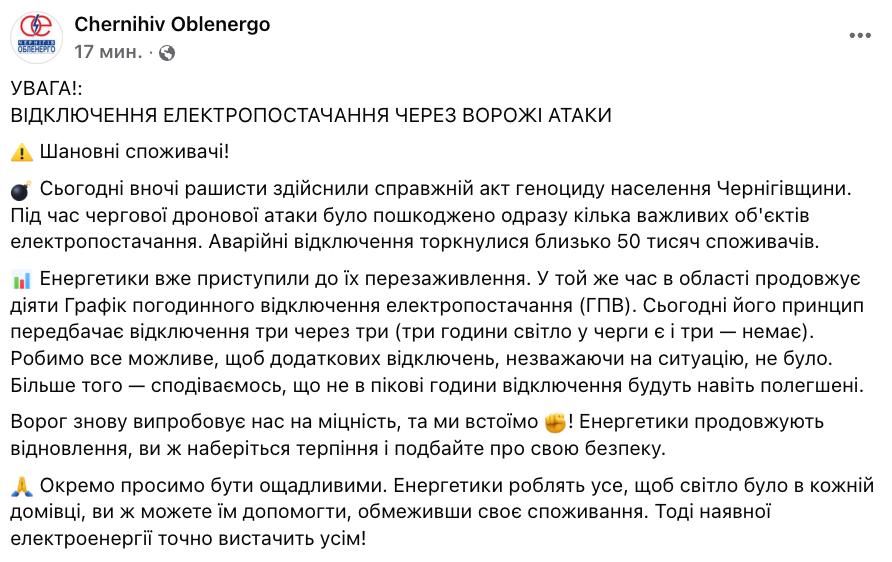 На Чернігівщині безпілотники вдруге за добу пошкодили кілька об'єктів електропостачання. Без світла залишалося ще 50 тисяч абонентів.