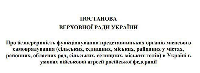 Проект постанови, який буде розглянутий Радою у середу, має цю колізію дозволити та продовжити повноваження місцевих органів влади на час дії воєнного стану.