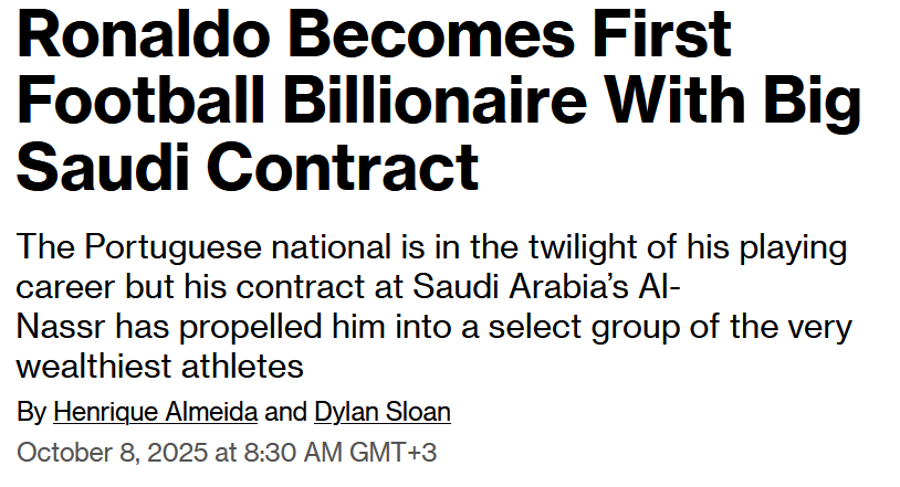 За даними Bloomberg Billionaires Index, статки Роналду нині оцінюють у $1,4 млрд. Це зробило 40-річного португальця першим футболістом, який досяг такого рівня фінансового успіху.