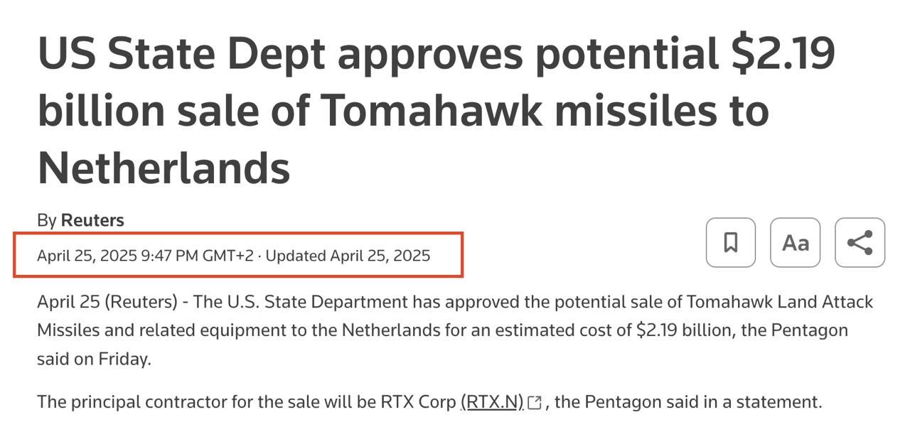 Єдина згадка про рішення США продати "Томагавки" Нідерландам у кількості 175 ракет на суму 2,19 мільярда доларів датована ще 25 квітня 2025 року, коли про поставки таких ракет Україні взагалі не йшлося.