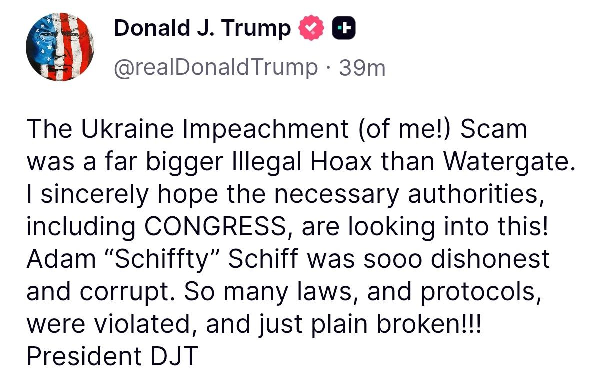 "Український імпічмент (стосовно мене!) був набагато незаконнішим обманом, ніж Уотергейт. Я щиро сподіваюся, що відповідні органи, включаючи конгрес, розслідують це! Адам Шифф був настільки нечесним і корумпованим. Було порушено і просто знехтувано стільки законів і процедур!" – написав президент США.