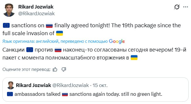 "Санкції ЄС проти Росії нарешті були узгоджені сьогодні ввечері! 19-й пакет з моменту повномасштабного вторгнення в Україну", - написав він.