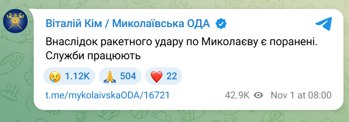 "Внаслідок ракетного удару по Миколаєву є поранені. Служби працюють", - зазначив Кім.