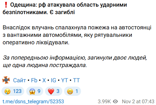 У ніч проти 2 листопада російські війська атакували Одеську область дронами-камікадзе. В Ізмаїльському районі спалахнула автостоянка з вантажними автомобілями, є загиблі та поранені.