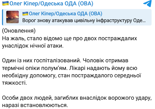 "На жаль, стало відомо ще про двох поранених у результаті нічної атаки. Один із них госпіталізований з термічними опіками, лікарі надають йому всю необхідну допомогу, стан потерпілого середньої тяжкості", - зазначив чиновник.