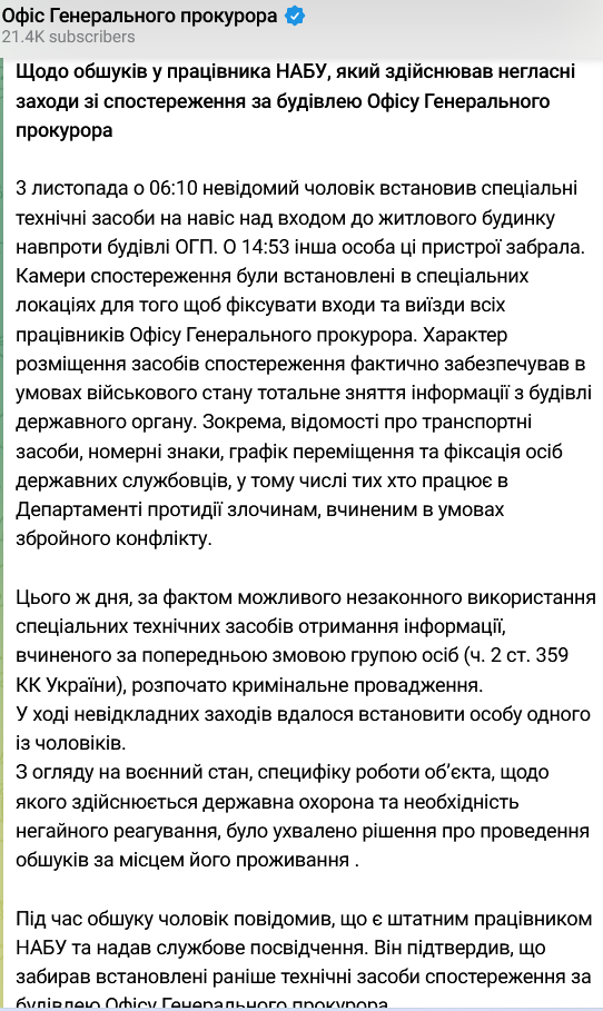 Пізніше Офіс генерального прокурора (ОДП) прокоментував обшук у співробітника НАБУ, про який раніше повідомило Бюро.