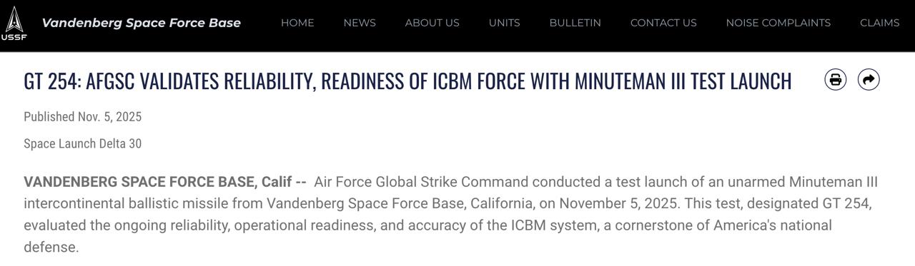 Випробування були давно заплановані та проводяться на регулярній основі, вони мали суто технічний характер і спрямовані на збір даних про надійність та точність систем ракети, підкреслили в командуванні.