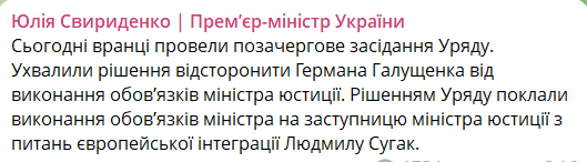 "Сьогодні вранці провели позачергове засідання уряду. Ухвалили Германа Галущенка від виконання обов'язків міністра юстиції. Рішенням уряду поклали виконання обов'язків міністра на заступника міністра юстиції з питань європейської інтеграції Людмилу Сугак", - йдеться у повідомленні.