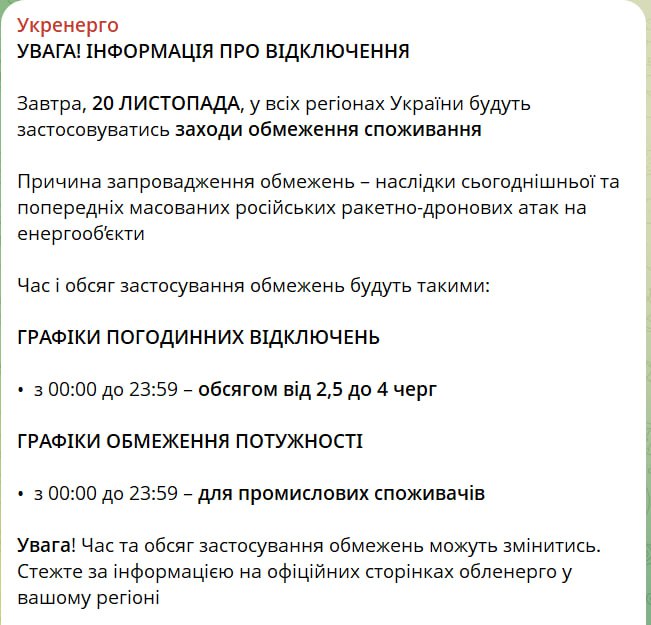 18.08 Відключення світла завтра будуть у всіх регіонах – цілодобово обсягом від 2,5 до 4 черг, повідомляє "Укренерго".