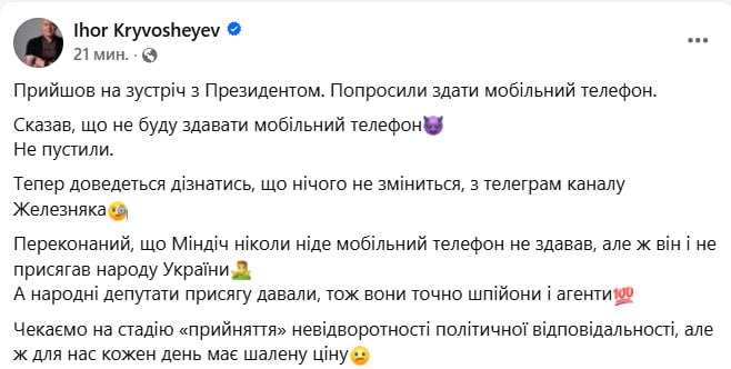 Водночас депутат від "Слуги народу" Ігор Кривошеєв відмовився заходити на зустріч із Зеленським без телефону.