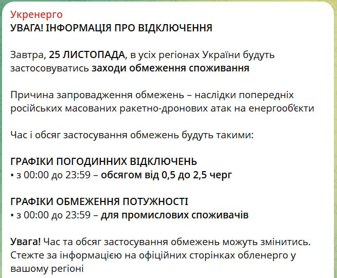 18:05 Відключення світла завтра будуть у всіх регіонах – цілодобово обсягом від 0,5 до 2,5 черг, повідомляє Укренерго.
