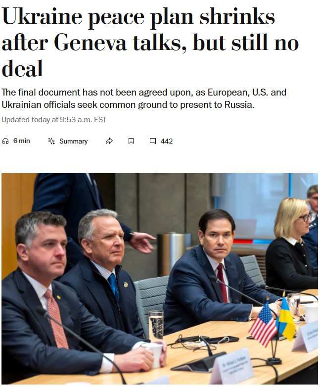 При цьому The Washington Post повідомляє, що США та Україна ще не погодили підсумкову версію мирного плану, і його обговорення йде на основі пропозицій США, а не Європи.