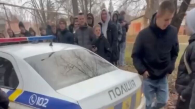 Навколо службового автомобіля правоохоронців зібралося понад 15 юнаків, стаючи поперек дороги на виїзд із прибудинкової території. Вони знімали те, що відбувалося, на телефони і вигукували лайки.