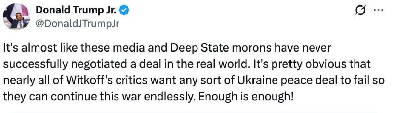 "Схоже, ці ЗМІ та ідіоти з глибинної держави ніколи не вели успішних переговорів у реальному світі. Цілком очевидно, що майже всі критики Уіткоффа хочуть провалу будь-якої мирної угоди з Україною, щоб вони могли продовжувати цю війну нескінченно. Досить!" – написав Дональд Трамп-молодший.