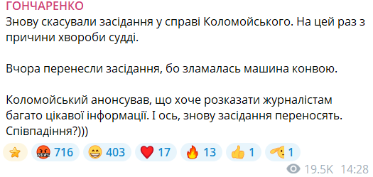 Гончаренко бачить зв'язок скасування цих засідань із нещодавніми заявами Коломойського про намір поділитися з журналістами цікавою інформацією.