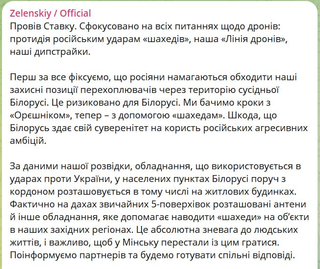 Президент України Володимир Зеленський заявив, що у Білорусі на дахах п'ятиповерхівок розташоване обладнання, яке допомагає РФ наводити "Шахеди".