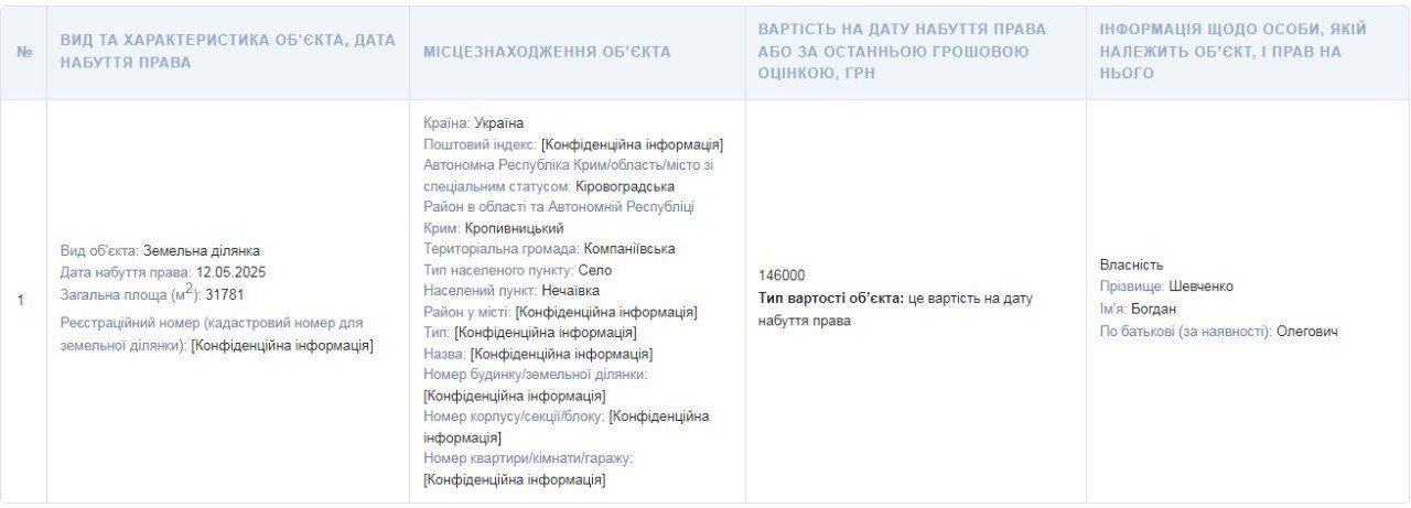 Також навесні він став власником земельної ділянки вартістю 146 тисяч гривень.