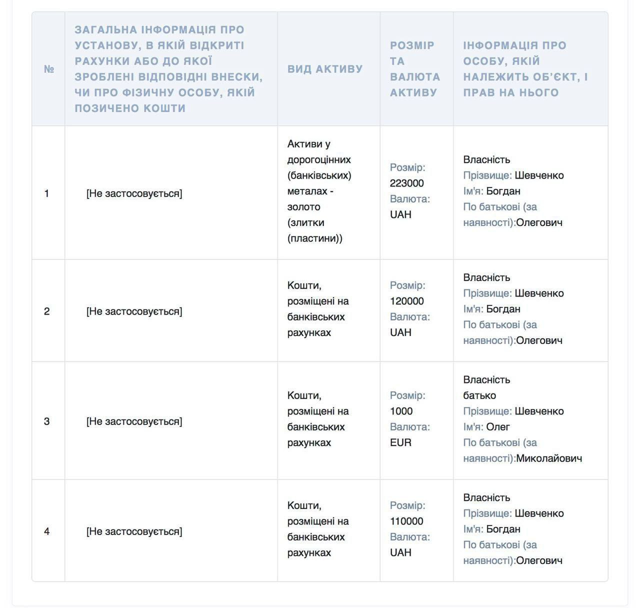 Колишній водій Кіровоградського обласного територіального центру комплектування Богдан Шевченко задекларував у 2025 році золоті зливки на 220 тис. грн.