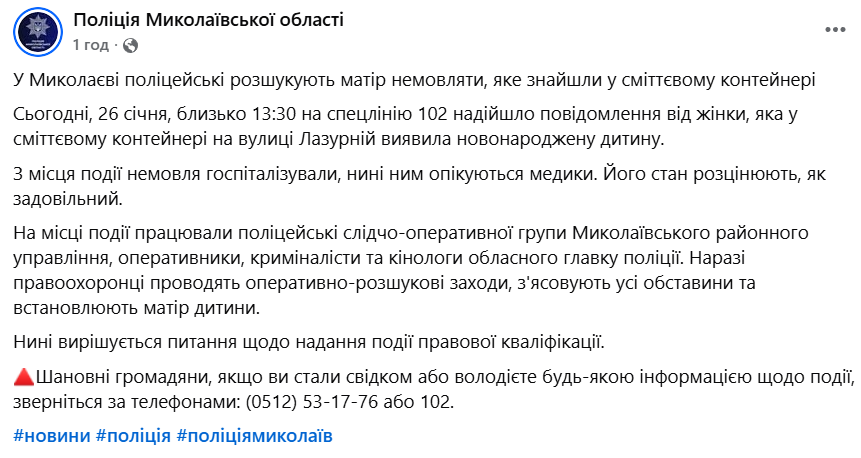"Сьогодні, 26 січня, близько 13:30 на спецлінію 102 надійшло повідомлення від жінки, яка у сміттєвому контейнері на вулиці Лазурній виявила новонароджену дитину. З місця події немовляти госпіталізували, в даний час за ним доглядають медики. Його стан оцінюють як задовільний. Наразі правоохоронні органи проводять оперативно-розшукові заходи, з'ясовують усі обставини та встановлюють матір дитини. Вирішується питання про правову кваліфікацію події", - заявили в поліції.