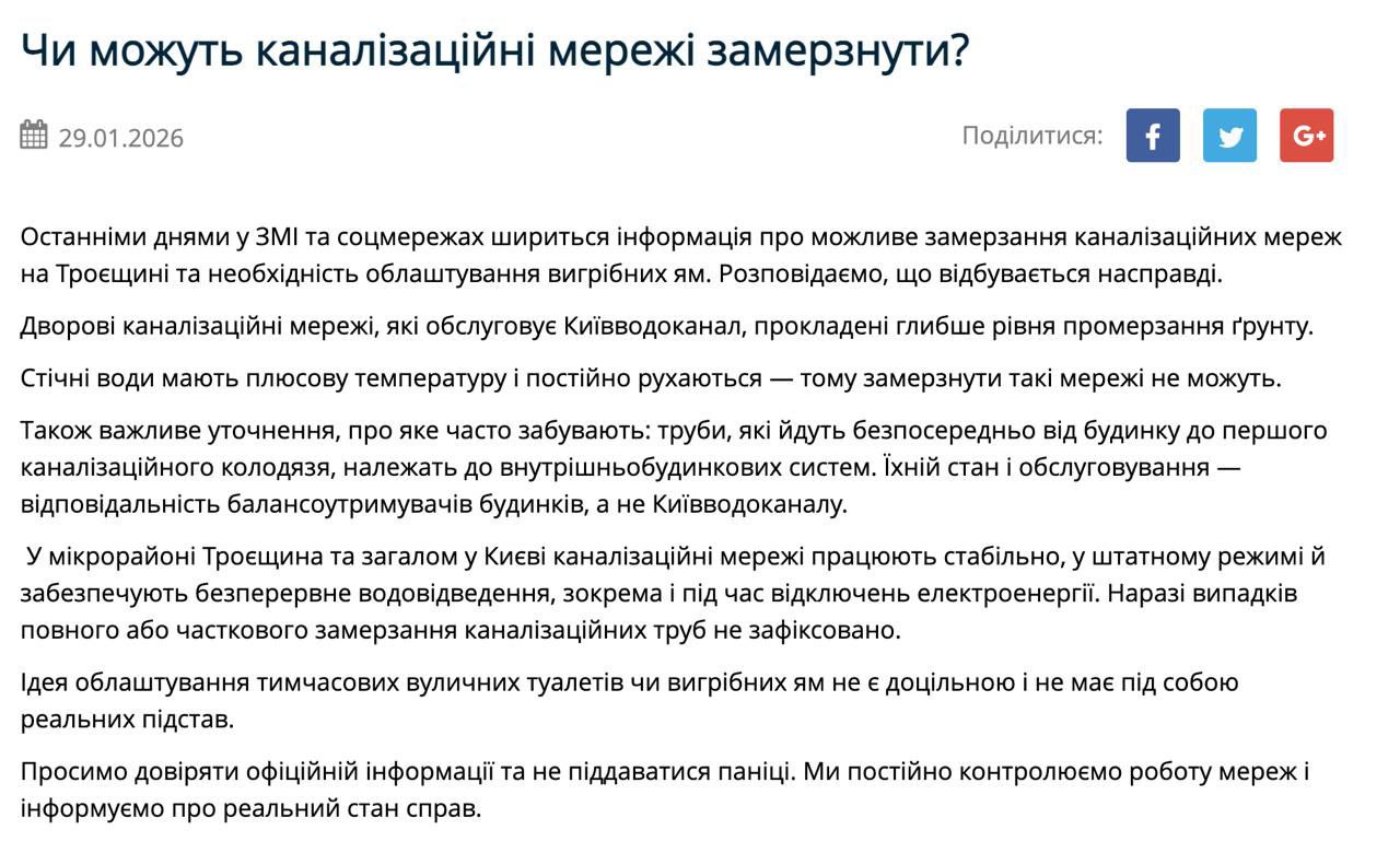 Про це заявила прес-служба Київводоканалу на своєму сайті, коментуючи тему вуличних туалетів на Троєщині, яку порушив голова району Максим Бахматов у зв'язку з загрозою замерзання каналізації в будинках, що залишилися без опалення.