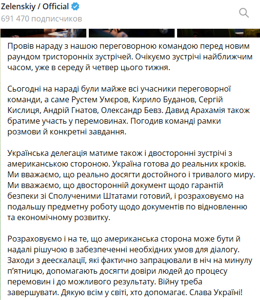 Про це Зеленський написав у своєму телеграм-каналі за підсумками зустрічі з українською делегацією.