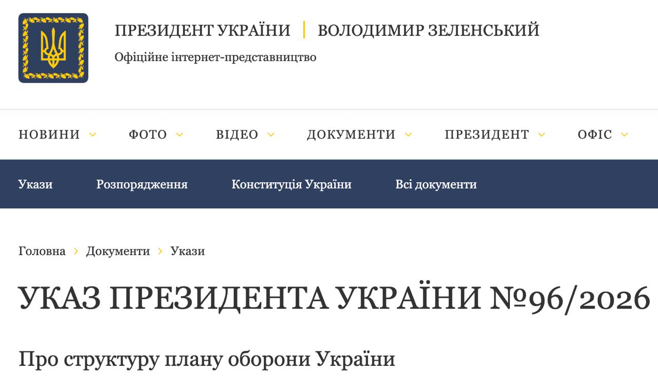 Про це йдеться в указі №96/2026 щодо структури плану оборони України, опублікованому на сайті глави держави.