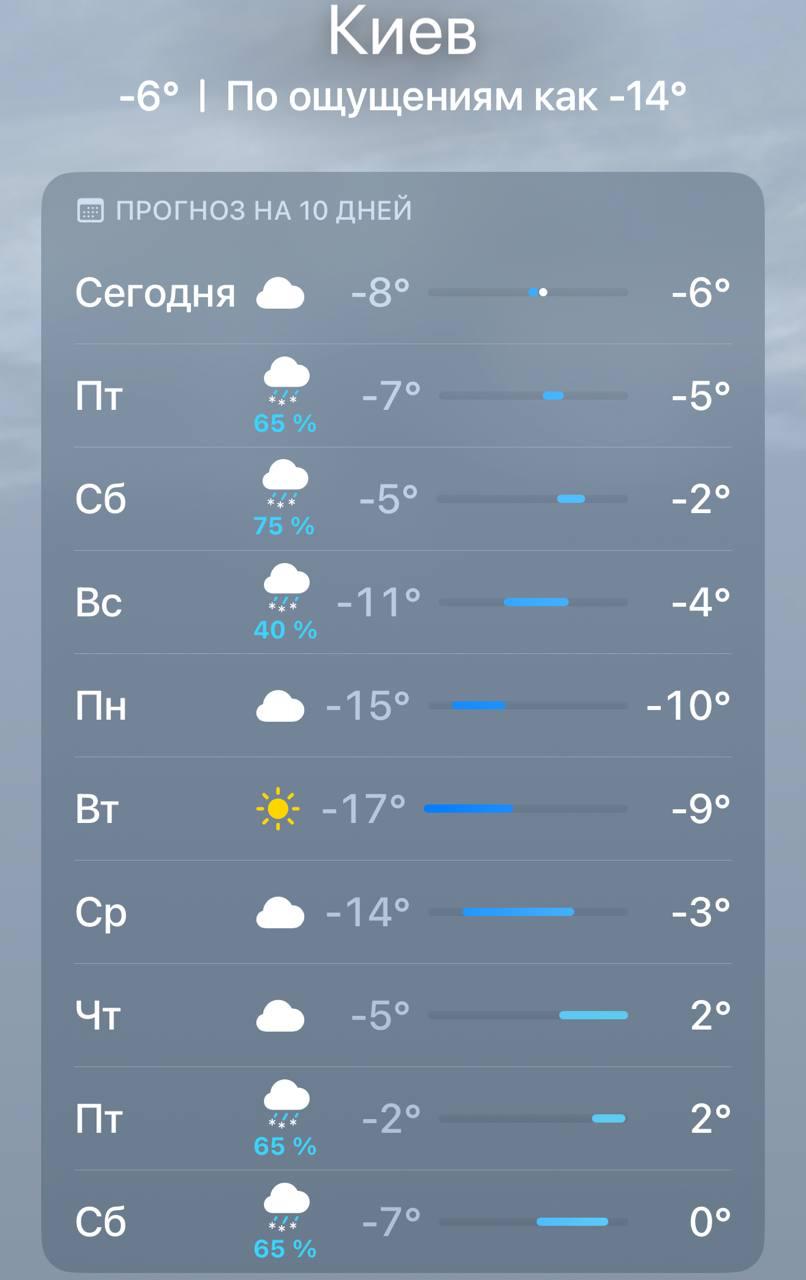 Синоптик зазначає, що з початку наступного тижня нічні температури можуть знижуватися до -12...-18°C, а в північних областях - до -19...-25°C. Попередньо, з 12 лютого очікується ослаблення морозів та підвищення температури на 3–6°C, але прогноз потребує уточнення.