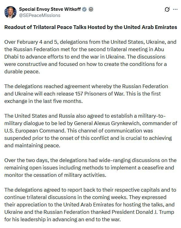 "4 і 5 лютого делегації Сполучених Штатів Америки, України та Російської Федерації зустрілися на другій тристоронній зустрічі в Абу-Дабі для просування зусиль щодо припинення війни в Україні. Обговорення мали конструктивний характер і були зосереджені на тому, як створити умови для міцного миру. 157 військовополонених. Це перший обмін за останні п'ять місяців. питань, включаючи методи реалізації припинення вогню та моніторингу припинення військових дій.