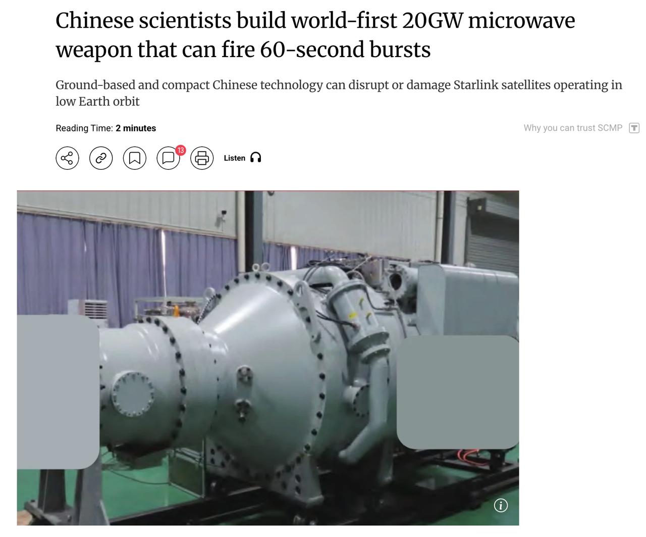 Колектив учених із Північно-Західного інституту ядерних технологій у китайському Сіані розробили перше у світі встановлення мікрохвильової зброї. Вона здатна видавати 20 гігават потужності протягом хвилини і порушувати роботу або пошкоджувати супутники на низькій навколоземній орбіті, у тому числі Starlink.