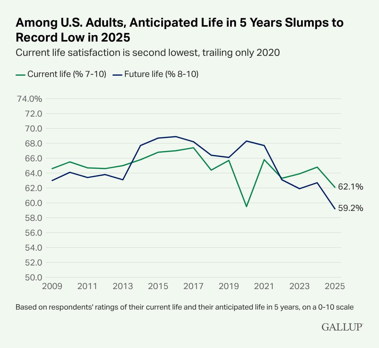 За даними опитування, частка дорослих американців, які вважають, що їхнє життя в наступні п'ять років буде благополучним, у 2025 році склала 59,2%, що стало найнижчим показником за майже два десятиліття.