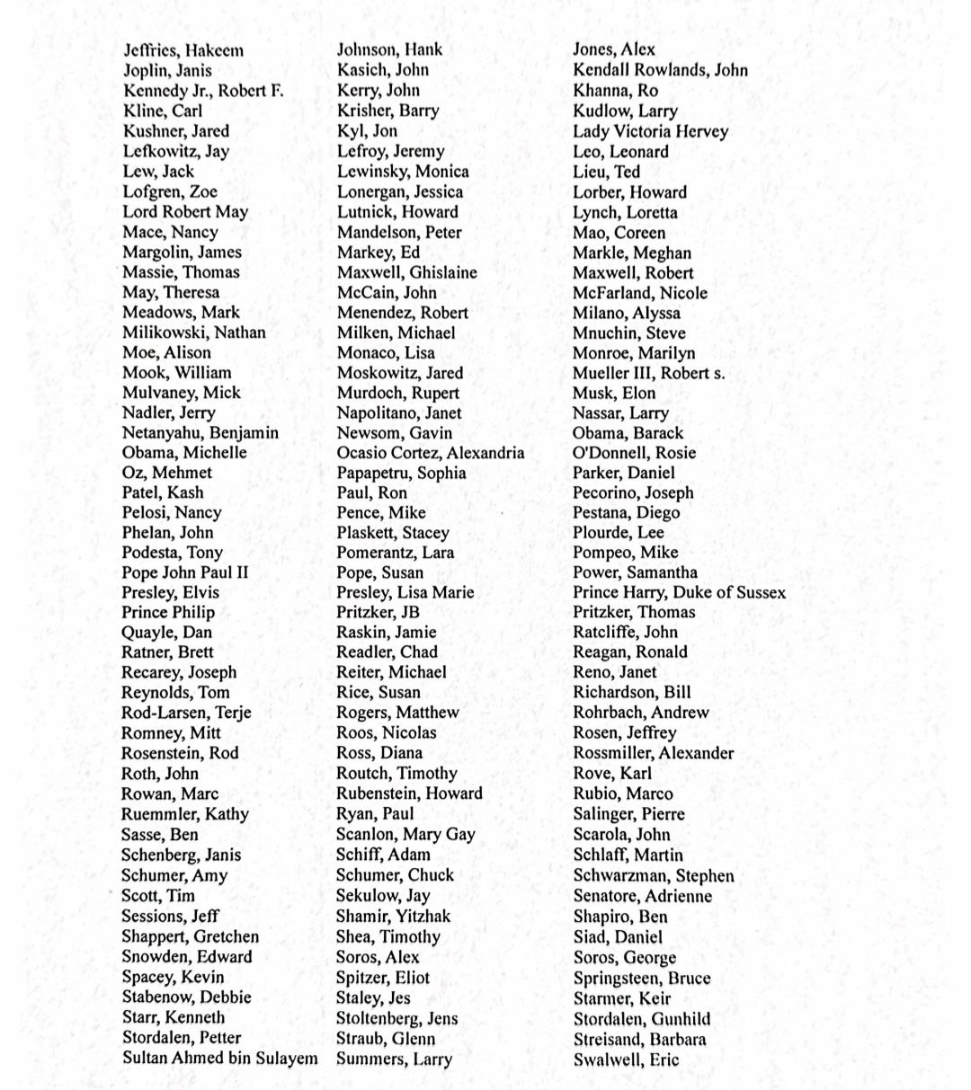 Серед фігурантів списку - Дональд Трамп, Барак та Мішель Обама, принц Гаррі, Білл Гейтс, Вуді Аллен, Кім Кардаш'ян, Курт Кобейн, Марк Цукерберг та Брюс Спрінгстін. У списку понад 300 осіб - це ті, хто були або є державними посадовими особами чи публічними персонами та чиї імена щонайменше один раз зустрічаються у матеріалах.