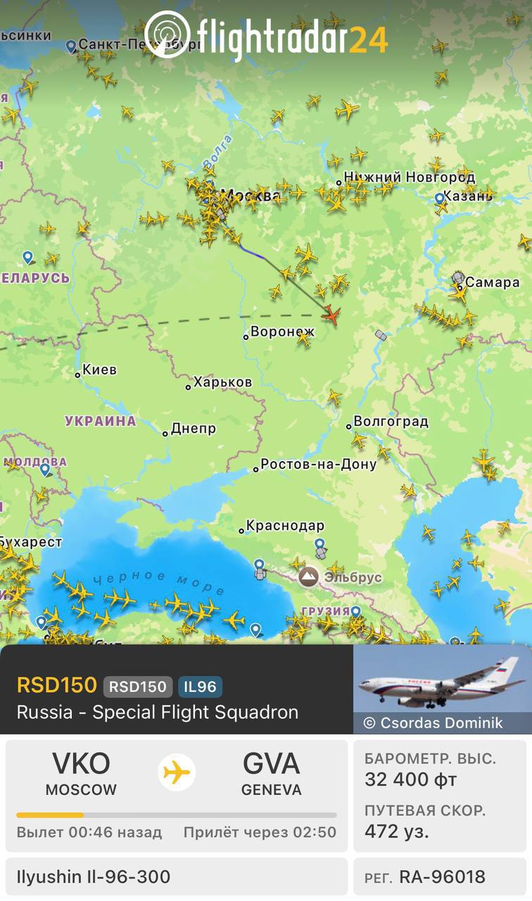 Тим часом, судячи з даних сервісу Flightradar, літак із російською делегацією, який вилетів із Москви до Женеви, полетить не найкоротшим маршрутом через Польщу та Німеччину, а облетить Європу з півдня.