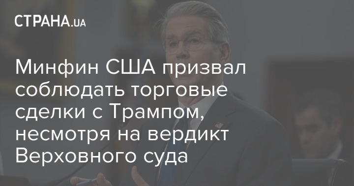 Міністр фінансів США Скотт Бессент закликав країни дотримуватися ув'язнених з американським лідером Дональдом Трампом торгових домовленостей, незважаючи на рішення Верховного суду про скасування мит.