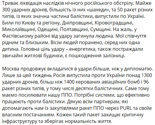 "Били по Києву та області, Дніпропетровщині, Кіровоградщині, Миколаївщині, Одещині, Полтавщині, Сумщині", - пише президент.