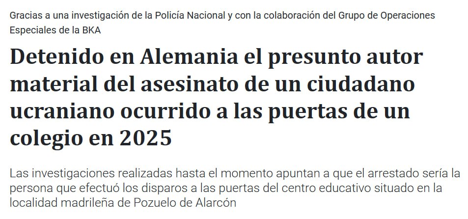 "Завдяки розслідуванню, проведеному агентами Національної поліції, підозрюваний у вбивстві громадянина України А.П., яке сталося 21 травня 2025 року біля воріт школи в мадридському місті Посуело-де-Аларкон, було заарештовано в місті Хайнсберг (Німеччина). арешт у співпраці з групою спеціальних операцій німецької поліції.
