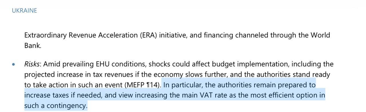 "Влада, як і раніше, готова підвищити податки, якщо це буде необхідно, і розглядає підвищення основної ставки ПДВ як найбільш ефективний варіант за такої непередбачуваної ситуації", - йдеться в документі.