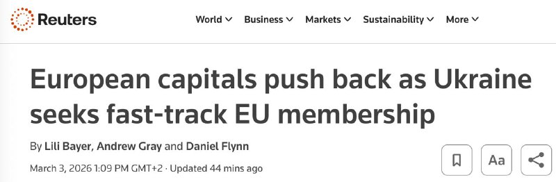 Мета президента Володимира Зеленського вступити до ЄС до 2027 року є нереалістичною, констатує Reuters.