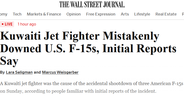 Повідомляється, що на тлі тривоги пілот кувейтського винищувача F/A-18 відкрив вогонь по цілям, що наближаються, прийнявши їх за загрозу. Він випустив три ракети "повітря - повітря", які вразили три американські F-15E Strike Eagle.