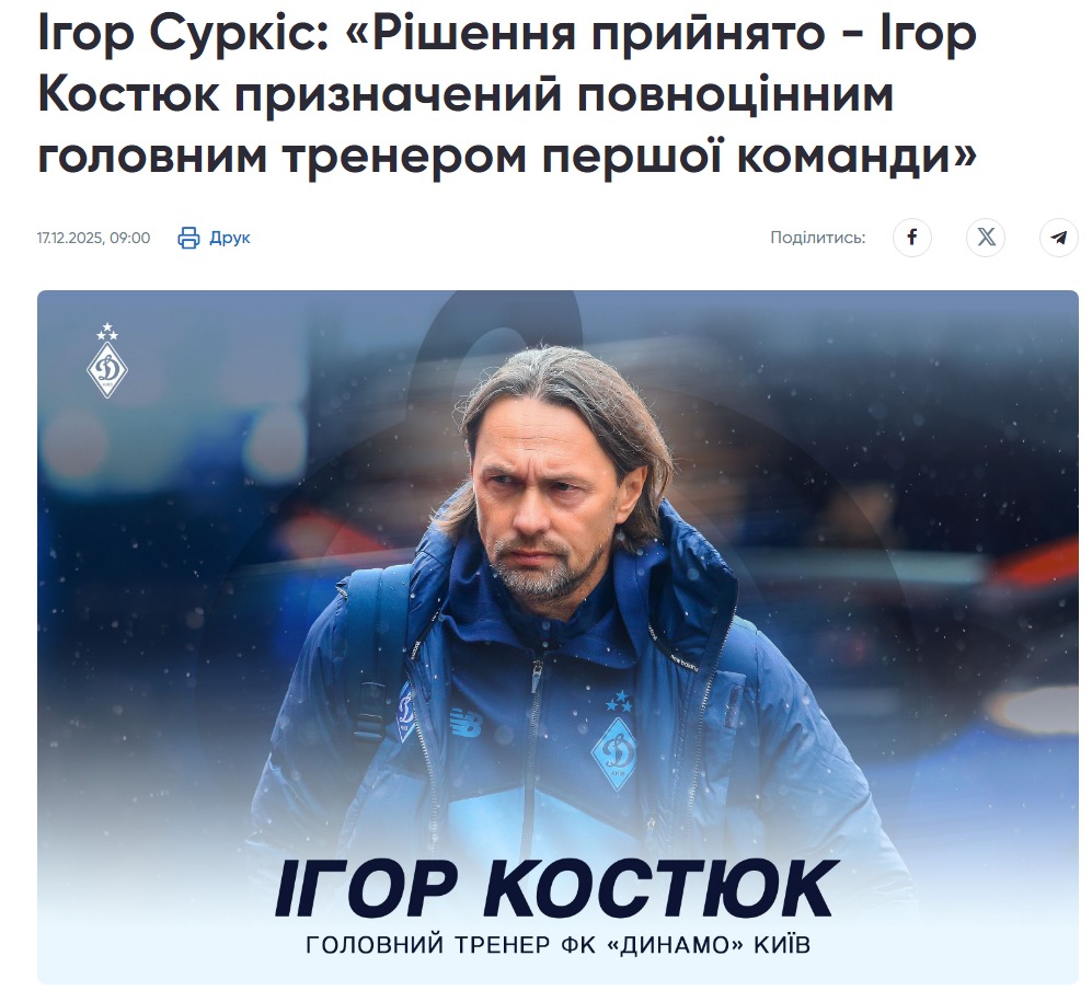 Новим головним тренером київського футбольного клубу "Динамо" призначено Ігоря Костюка.