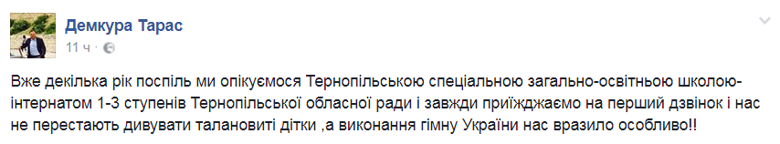 "Уже несколько год подряд мы занимаемся Тернопольской специальной общеобразовательной школой-интернатом 1-3 степеней Тернопольского областного совета и всегда приезжаем на первый звонок и нас не перестают удивлять талантливые дети, а исполнение гимна Украины нас поразило особенно" - говорится в сообщении.
