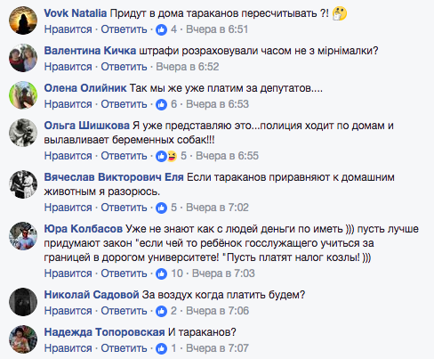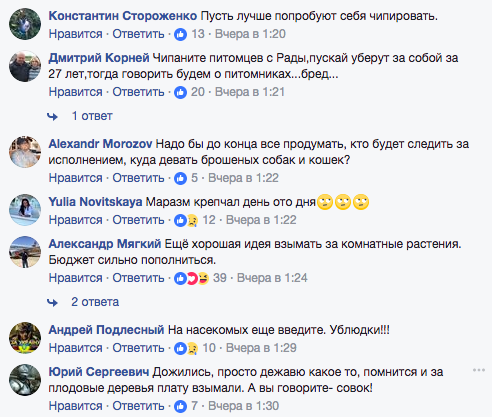 Страница "Страны" в Facebook собрала немало отзывов негодующих граждан. Кто-то предлагал депутатам сперва чипировать самих себя, а затем - домашних любимцев, кто-то прогнозировал увеличение количества бездомных животных после принятия документа.