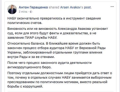 "В ближайшее время должен быть закончен процесс отбора аудитора НАБУ от Верховной Рады Украины, заблокированный отдельными группами влияния внутри Рады и за ее стенами. После чего - процесс законного аудита деятельности антикоррупционного бюро. Поэтому отдельным должностным лицам придется дать ответ о том, почему в отдельных случаях НАБУ занимается выборочным преследованием по политическим мотивам, вместо реальной борьбы с коррупцией", - написал он.
