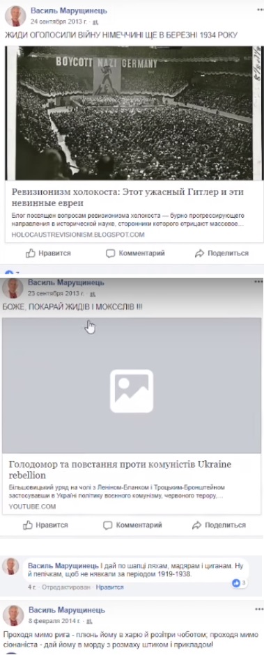 Марушинец делал перепосты материалов, в которых оправдывается Холокост и события в Бабьем Яру и призывал отвоевать территории у Польши и Венгрии. Он также писал, что "быть фашистом почетно".