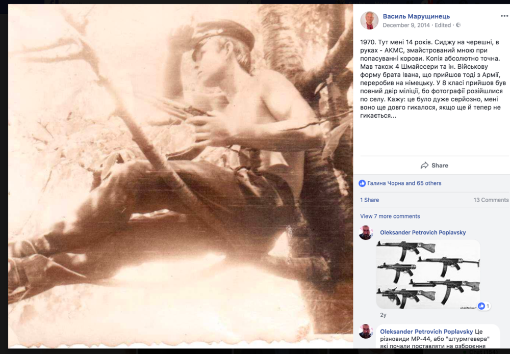 О том самом смастеренном в юности автомате, о котором нам рассказал односельчанин Марушинца, он сам также вспоминает в подписи под архивным фото: "Тут мне 14 лет. Сижу на черешне, в руках – АКМС, сделанный мною, когда пас корову. Копия абсолютно точная. Имел также 4 Шмайссер (немецкий автомат времен войны. – Прим. ред.) Военную форму брата Ивана, который пришел тогда из армии, переделал на немецкую. В 8 классе пришел полный двор милиции, потому что фотографии разошлись по селу. Говорю: это было очень серьезно, мне оно еще долго икалось, если еще и теперь не икается".