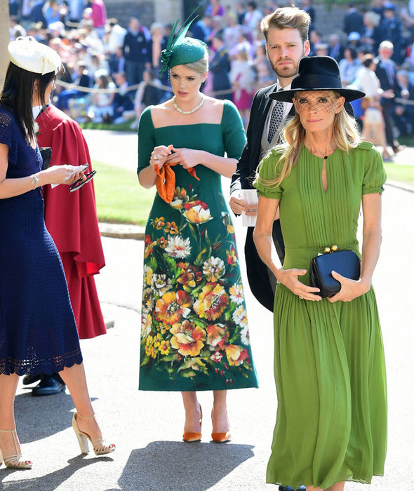 Это приталенное платье горчичного цвета и элегантная шляпка с вуалью, которые надела супруга американского актера Джорджа Клуни, 40-летняя юрист Амаль Клуни, и зеленое платье с цветами на юбке от Dolce & Gabbana у 28-летней Китти Спенсер – племянницы принцессы Дианы и двоюродной сестры жениха.