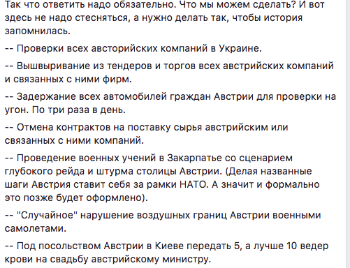 На своей странице в Facebook журналист Максим Кухар предлагает "обязательно ответить". А именно "вышвырнуть из тендеров и торгов все австрийские компании и связанных с ними фирмы, отменять контракты на поставку сырья австрийским или связанных с ними компаниям, проводить военные учения в Закарпатье со сценарием глубокого рейда и штурма столицы Австрии (делая названные шаги Австрия ставит себя за рамки НАТО. А значит и формально это позже будет оформлено), "случайно" нарушать воздушные границы Австрии военными самолетами".